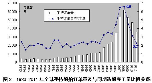 上述數(shù)據(jù)顯示,2011年世界新船完工量要比同期新船成交量高出9600萬載重噸,訂單嚴(yán)重入不敷出直接導(dǎo)致這一期間全球手持船舶訂單量持續(xù)大幅萎縮。截至到2011年底,世界手持船舶訂單量為5814艘、35610萬載重噸、11251萬修正總噸,較年初分別萎縮了25.4%、26.7%和22.6%。比較現(xiàn)有手持訂單量與造船完工量之間關(guān)系,不難發(fā)現(xiàn),手持訂單量與同期造船完工量之比已從2008年頂峰的6.6迅速下滑至2.2,世界船舶工業(yè)已經(jīng)進(jìn)入嚴(yán)重“饑荒”期,未來船舶市場注定難以逃脫惡性競爭的局面。