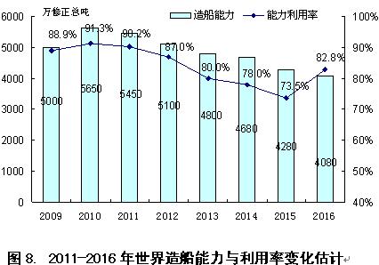 筆者認(rèn)為,這種矛盾最終會通過造船能力的逐漸萎縮和產(chǎn)能利用率下降的形式表現(xiàn)出來。據(jù)英國克拉克松公司估計(jì),2011-2016年期間全球造船能力將縮減28%,并且,在此基礎(chǔ)上全球造船能力利用率于2015年下滑至階段性低點(diǎn)73.5%,然后于2016年開始出現(xiàn)回升。為此,筆者認(rèn)為,同處于產(chǎn)能萎縮和能力利用率下降的階段,新船價格有效反彈或回升缺乏最基本的支撐,更何況,處于世界造船業(yè)去產(chǎn)能化初期階段的2012年,價格回升的可能性的概率極低。