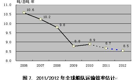 就2012年走勢看,衡量運(yùn)力供求關(guān)系變化的一個核心指標(biāo)――船隊(duì)運(yùn)輸效率,即每總噸運(yùn)力年運(yùn)輸貨物量(噸/總噸.年),仍在走低。筆者主要結(jié)合2012年運(yùn)力和海運(yùn)量預(yù)計(jì)的增長,大體估算如下:船隊(duì)增長方面,結(jié)合可能的訂單交付量和拆解量,估計(jì)到2012年底全球船隊(duì)保有量將達(dá)到11.046億總噸,較2011年增長6.6%;海運(yùn)量增長方面,取2011年的增速(IMF對2011年和2012年世界經(jīng)濟(jì)增速預(yù)測都為4.0%),估計(jì)2012年全球海運(yùn)總量將達(dá)94.3億噸;如此一來,即使不考慮船隊(duì)降速行駛的情況下,2012年全球船隊(duì)運(yùn)輸效率將由2011年的8.7(噸/總噸.年)下降至8.5(噸/總.年),某種程度上表明2012年全球航運(yùn)市場運(yùn)力供求關(guān)系仍朝惡化態(tài)勢方向發(fā)展。假設(shè)上述分析成立,2012年國際航運(yùn)費(fèi)率估計(jì)仍會處于低位水平,船東經(jīng)營狀況也不會有好的表現(xiàn),船東新造船投資信心和欲望估計(jì)也難被有效調(diào)動。