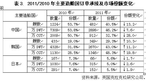 2011年世界造船仍然延續(xù)中韓兩國爭霸的局面,但是,市場需求結(jié)構(gòu)的變化導(dǎo)致兩國市場份額出現(xiàn)交叉變化。按克拉克松公司統(tǒng)計(jì),中國船廠承接訂單482艘、2898萬載重噸、912萬修正總噸,所占世界份額分別為40.5%、46.2%和32.7%,以艘數(shù)和載重噸計(jì),中國新接訂單市場份額仍占據(jù)全球第一,但份額較上一年分別下降13.2個百分點(diǎn)和7.6個百分點(diǎn),以修正總噸計(jì),中國市場份額為32.7%,較上一年下滑了28個百分點(diǎn),較韓國(48.3%)低19個百分點(diǎn),退居世界第二。