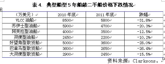 二手船市場對航運(yùn)市場的反應(yīng)較新造船市場更為直接,兩者存在相對同步性。國際航運(yùn)市場的低迷,加上船東看空后期市場情緒蔓延,2011年世界二手船市場成交水平不僅繼續(xù)延續(xù)2010年萎縮態(tài)勢,而且二手船價格再度出現(xiàn)深幅下挫,船東船隊(duì)資產(chǎn)價格再度大幅縮水。統(tǒng)計(jì)表明,2011年全年共成交二手船1064艘、5121萬載重噸,較上一年下滑了19%;典型船型5年船齡二手船價格平均跌幅在20%左右,其中,VLCC油船、好望角型散貨船和巴拿馬型散貨船跌幅高達(dá)31.8%、28.0%和26.4%,遠(yuǎn)遠(yuǎn)超過同期新船價格下行幅度。