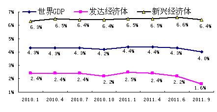 世界經(jīng)濟(jì)在經(jīng)歷2010年“脆弱而不平衡”的復(fù)蘇后,進(jìn)入2011年,這種復(fù)蘇再度遭遇挫折,形勢(shì)也變得更為復(fù)雜多變。從利比亞、敘利亞、埃及和也門(mén)為代表的中東地區(qū)政治危機(jī),到日本地震重創(chuàng)世界供應(yīng)鏈,到歐債危機(jī)不斷深化,再到標(biāo)準(zhǔn)普爾下調(diào)美債評(píng)級(jí)。一系列經(jīng)濟(jì)政治事件使得全球經(jīng)濟(jì)動(dòng)蕩不安,下行風(fēng)險(xiǎn)也不斷加大。2011年9月IMF大幅下調(diào)今明兩年全球經(jīng)濟(jì)增速預(yù)期,分別下調(diào)0.3%及0.5%,均降至4%的水平;發(fā)達(dá)經(jīng)濟(jì)體今年的經(jīng)濟(jì)增長(zhǎng)率由此前預(yù)計(jì)的2.2%下調(diào)至1.6%,2012年的增長(zhǎng)率由此前的2.6%下調(diào)至1.9%;新興及發(fā)展中經(jīng)濟(jì)體的經(jīng)濟(jì)增長(zhǎng)率由6.6%及6.4%分別下調(diào)至6.4%和6.1%。