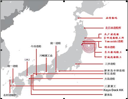 日本主要造船廠集中在南部、東南部的九州島和四國(guó)島等地區(qū),遠(yuǎn)離此次地震重災(zāi)區(qū),受相關(guān)影響也較小。此次災(zāi)害中,受災(zāi)船廠主要集中于日本東北地區(qū),主要有北日本造船、山西船廠、鈴木造船所、木戶(hù)浦造船和吉田造船鐵工所等,但這些船廠均是以生產(chǎn)小型船舶為主的小船廠,如山西船廠現(xiàn)有的手持訂單中有4艘2.4萬(wàn)載重噸的散貨船,以及2艘不到1萬(wàn)載重噸的汽車(chē)運(yùn)輸船。很顯然,此次海嘯并沒(méi)有給日本造船業(yè)產(chǎn)生多大實(shí)質(zhì)性的沖擊。