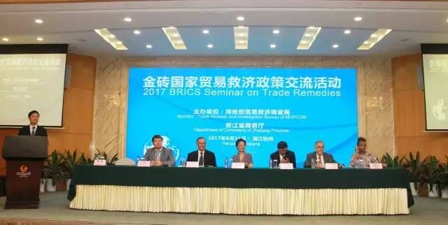 2017年8月31日上午“金磚國家貿(mào)易救濟政策交流活動會”在杭州浙江國際大酒店召開。商務部、商務廳、各地市商務局領(lǐng)導、律師專家及預警點的預警專員等120人出席了會議。浙江省分管商務工作的梁黎明副省長出席會議并作了熱情洋溢的致辭。商務部貿(mào)易救濟調(diào)查局王賀軍局長,介紹了全國“二反一?!钡男蝿?,也肯定了浙江省在貿(mào)易救濟工作中作出的種種努力。尤其是出口預警示范點工作及“四體聯(lián)動”應訴工作取得了好的成績。會議上半段,由省商務廳韓杰副廳長主持會議。舟山市出口船舶預警示范點、舟山市出口水產(chǎn) 警示范點預警專員參加了會議。