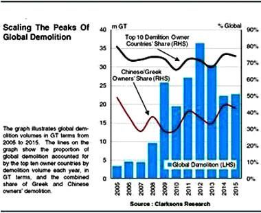 雖然拆船有所放緩,2014年和2015年的拆船總量約高于2005年至2013年年平均1810萬(wàn)GT的25%。受中國(guó)出口至印度廉價(jià)鋼坯的影響,廢鋼價(jià)格走低,自2015年來(lái),降幅已達(dá)40%。