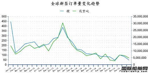 據(jù)克拉克松數(shù)據(jù)統(tǒng)計(jì),2015年2月份全球船企新簽訂單48艘、共計(jì)4883485載重噸。與2015年1月份全球新簽訂單85艘、共計(jì)6711260載重噸相比較,數(shù)量環(huán)比下降37艘,噸位下降27.23%。與2014年2月份全球新簽訂單248艘、共計(jì)13651438噸相比較,艘數(shù)同比下降200艘,噸位同比下降64.23%。