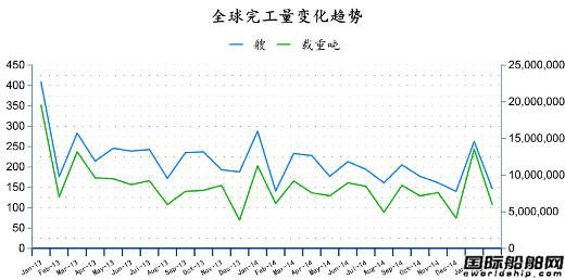 數(shù)據(jù)顯示,2015年2月份全球船廠共交付新船147艘,共計(jì)6002687載重噸。與2015年1月份全球新簽訂單262艘、共計(jì)13555954載重噸相比較,數(shù)量環(huán)比下降43.89%,噸位環(huán)比下降55.72%。與2014年2月份全球船廠共交付新船146艘,共計(jì)5996031載重噸相比較,數(shù)量上升1艘,噸位同比上升0.11%。