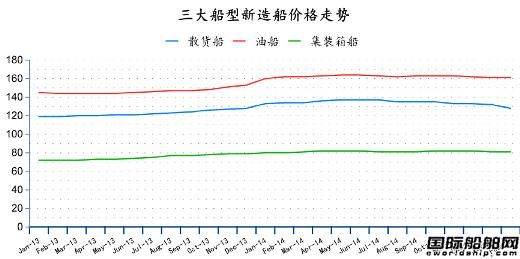 2月份散貨船、油船和集裝箱船新在造船價(jià)格指數(shù)為128點(diǎn)、161點(diǎn)和81點(diǎn),油船環(huán)比下降4點(diǎn),散貨船、集裝箱船持平上月。