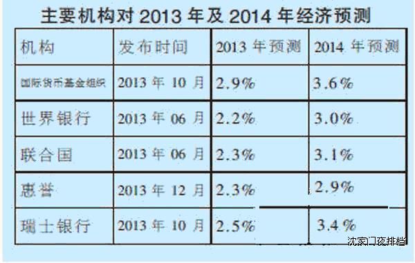 全球經(jīng)濟(jì)復(fù)蘇:2014年,全球經(jīng)濟(jì)復(fù)蘇勢(shì)頭將持續(xù),主要機(jī)構(gòu)對(duì)2014年經(jīng)濟(jì)發(fā)展的預(yù)測(cè)表明了這一觀點(diǎn)(見表格)。