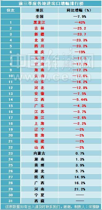 中國經(jīng)濟網(wǎng)記者疏理制作了前三季度各地進出口情況表,表中可以看出外貿(mào)形勢的復(fù)雜與嚴峻性,除了寧夏、西藏兩地未公布數(shù)據(jù),在已經(jīng)公布的29個省區(qū)中,有22省區(qū)外貿(mào)進出口值均為負增長。其中黑龍江情況最差,以同下降42%為全國倒數(shù)第一,吉林同比下降25.2%倒數(shù)第二,新疆同比下降23.7%倒數(shù)第三。東北三省在做整體經(jīng)濟不振的情況下,進出口貿(mào)易受到的不良影響也十分明顯。
